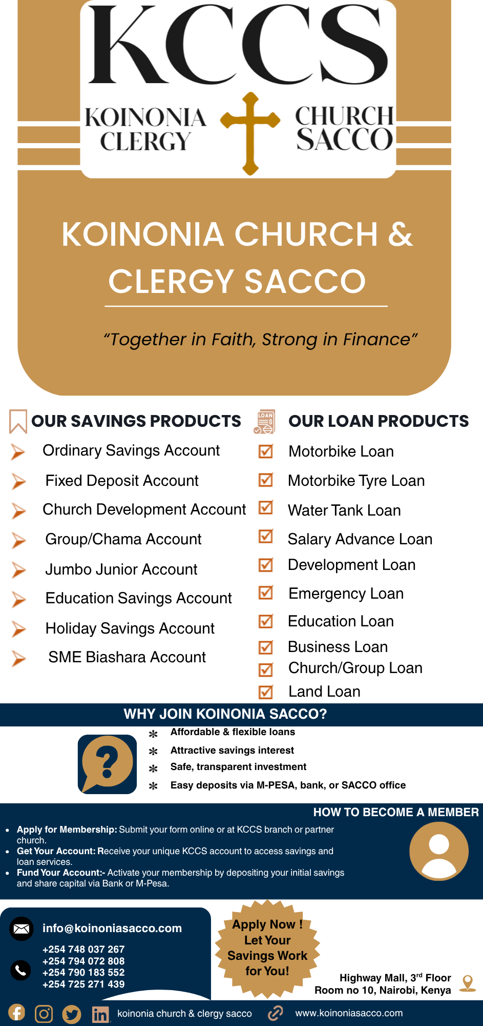 Registration Fee: Ksh 1,000. Monthly Deposit: Flexible. Save throughout the year for holidays or annual church events