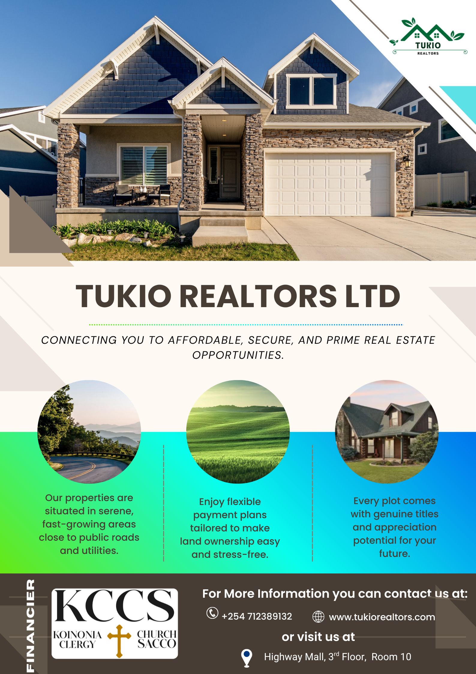 Empowering your journey to property ownership; discover secure, affordable land and homes with Tukio Realtors, financed by Koinonia SACCO. Your future starts here.